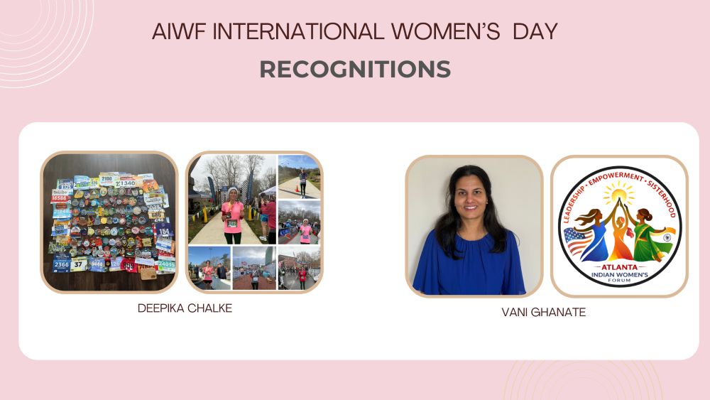 Deepika Chalke, a marathon runner who has completed both half and full marathons across all 50 states, and Vani Ghanate, the designer of the AIWF logo, were honored at the event. NRI Pulse editor-in-chief, Veena Rao, was invited to present the awards.