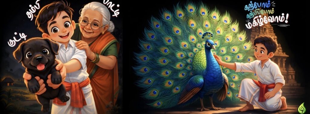 From that commitment emerged a cast of characters who anchor the learning experience in familiarity and warmth. “We created characters such as Thambi… with his black puppy Kutti, and then wise Paati,” he says. These figures are not merely decorative. They are vessels of culture and connection. Through them, children encounter Tamil not as an abstract system, but as lived experience.