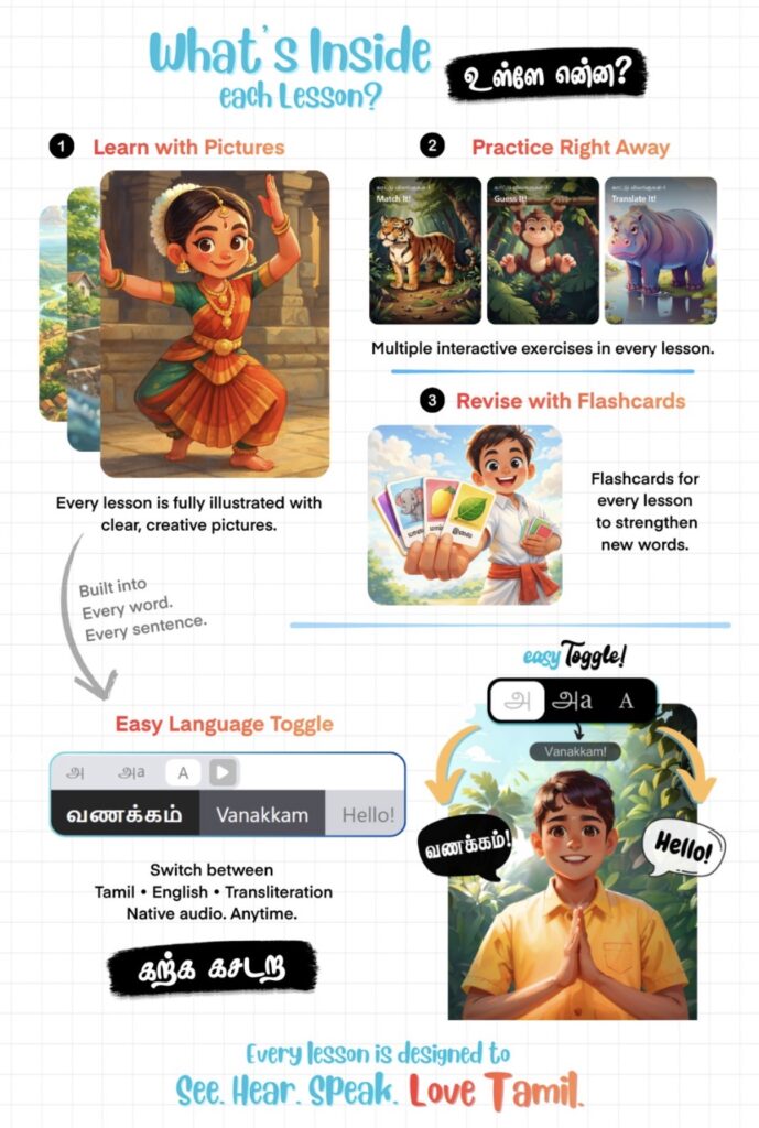 An invitation for children not just to learn Tamil, but to experience it. To see it, hear it, and feel it as part of their world. And, in time, to embrace it not as a lesson to complete, but as a journey to cherish.