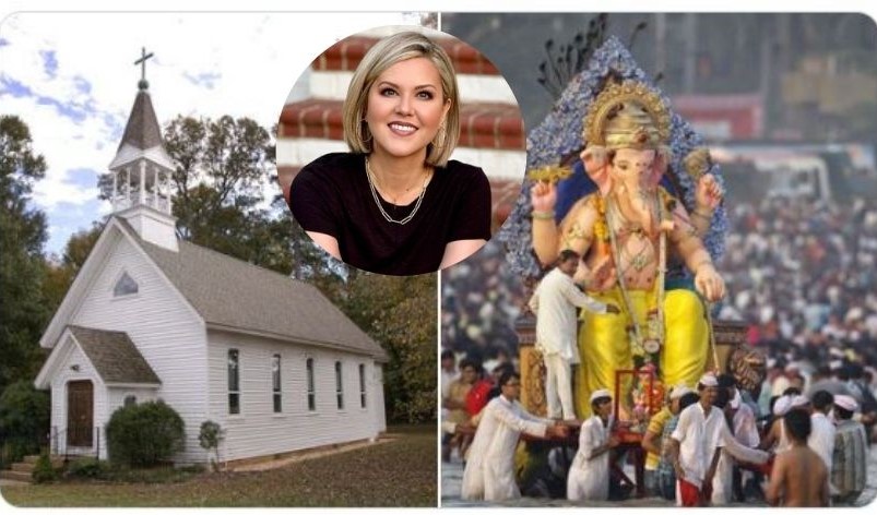 A social media post by American author and journalist Megan Basham has gone viral, after she juxtaposed a photo of a Christian church with an image of a Ganesh idol immersion and suggested that Christians are “biblically allowed” to oppose such cultural shifts.