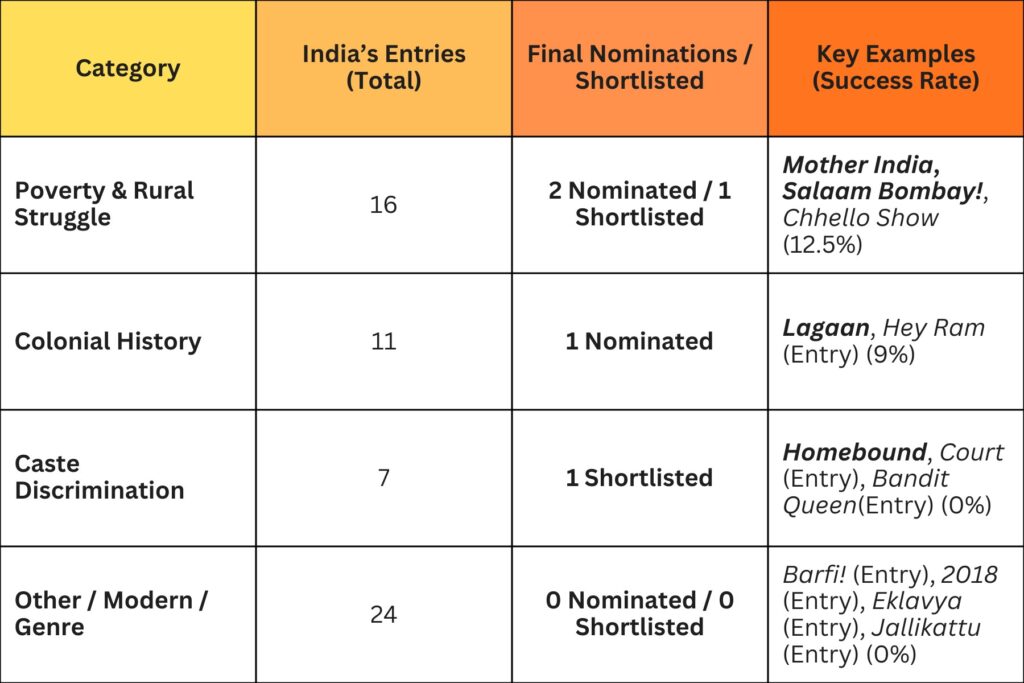 Since India began submitting films in 1957, a clear pattern has emerged: the “Western Gaze” only validates Indian stories when they serve as a form of “Poverty Tourism.” The data is undeniable: 100% of India’s final nominations in history have come from films about poverty, rural struggle, or colonialism.