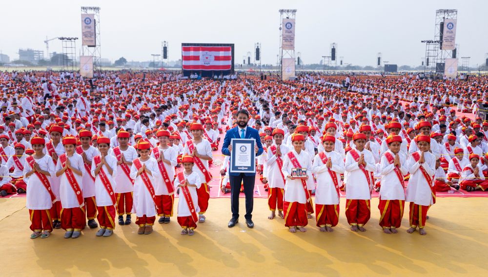 According to organizers, 12,723 children recited the Satsang Diksha, a Sanskrit scripture authored by Mahant Swami Maharaj, at the same time. The achievement was officially certified by Guinness World Records, whose officials traveled from England to verify the recital on site. A certificate recognizing the record was presented to Mahant Swami Maharaj during the event, which drew more than 200,000 devotees from around the world.
