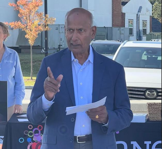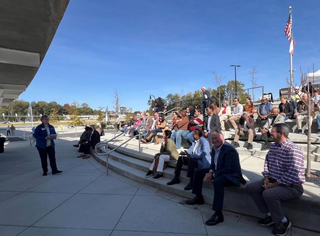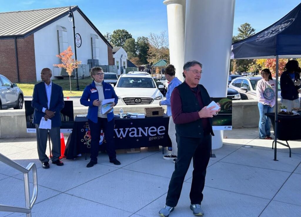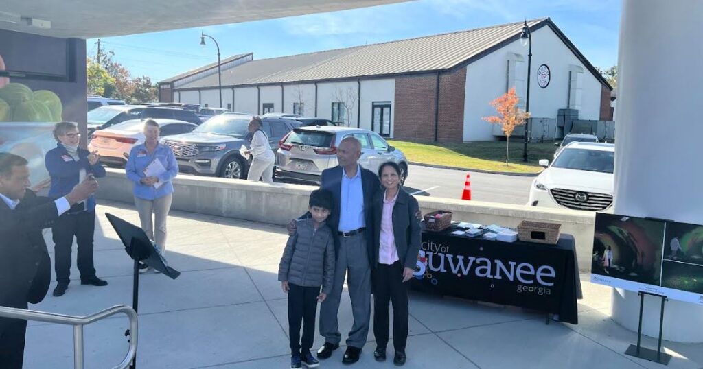 In his remarks, Suwanee Mayor Jimmy Burnette reflected on the city’s decades-long transformation from vision to vibrant reality. He recounted how, as a councilmember, he helped champion Suwanee’s comprehensive land use and downtown master plans, emphasizing open space, parks, and community connectivity. “We doubled our taxes to buy land to build parks and open space,” Burnette noted, explaining how early investments in public spaces like Town Center became catalysts for growth and civic pride. He credited the success of Suwanee’s art initiatives—sculptures, murals, and installations—with helping the city earn recognition as a leader in public art across Georgia. “The biggest thing about great communities is people,” Burnette said, thanking residents, city staff, and community leaders—including Dr. Neelagaru—for their support in shaping Suwanee into a place “kids want to come back to live.”