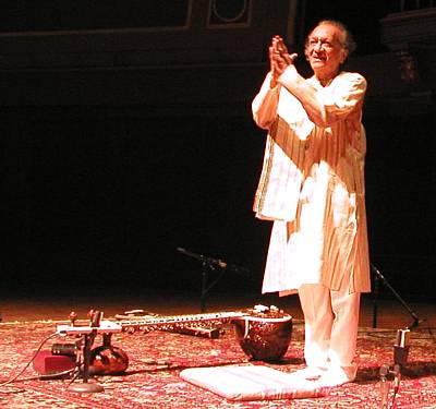 Ravi Shankar performed solo this time as Anoushka is on a one year sabbatical working on an album that Ravi ji mischievously called one with a classical base and some “mirch masala”. There was not a single empty seat in Ann Arbor’s Hill Auditorium which houses about 4500 plus people. As Ravi ji walked onto the stage, this seemingly frail man, as elegantly dressed as ever folded his hands in humble salute to the thundering ovation. His face lit up with a disarming sweetness, a trait that makes him so endearing.