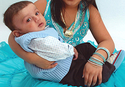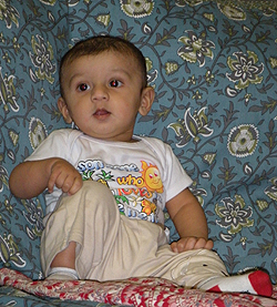 More about Rahil: He hates wearing clothes, and would walk around naked if he could all the time! He loves pretending he's Superman flying in the air, or an airplane. Also enjoys his newly acquired ability to balance himself, and attempts to stand up and walk before he tumbles over. He doesn't like having his pictures taken, so as soon as he sees someone with a camera, he stops smiling, closes his eyes, and tries to hide.