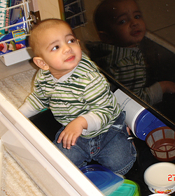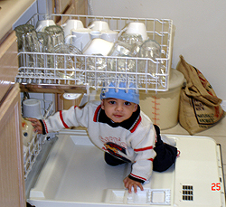 them, Opening all the cabinets and explore, emptying dish washer, Watching his Baby Einstein