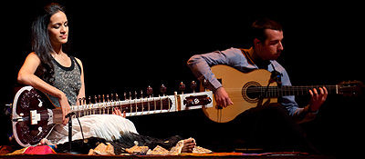 Attired in black and white Indian dres (with a sleeveless black sequined bodice), Anoushka on stage brought to the mind’s eye the very image of goddess Saraswati – sans the veena, which had been replaced by sitar. Anoushka, her fingers moving rapidly on the strings, her smile dazzling the watcher, created music that seemed to put the audience under a spell during the over two and half hour concert. A round of applause greeted Anoushka as she entered the stage and expressed her happiness at performing with an “amazing’ team of musicians. She was accompanied on the guitar by Melon Jimenez, Pirashanna Thevarajah (classical Indian percussionist) on Mridangam, Ghatam, Kanjira and Moorsing, Sanjeev Shankar on Shehnai and Bernhard Schimpelsberger on Cajon & other Spanish Percussion. They all gave an excellent account of their handwork by cutting out gem-like syllables of rhythm. Accompanying Anoushka on the vocals was the young and melodious Sandra Carrasco, who too was an instant hit with the audience with her Spanish numbers “Beuleria Con Ricardo” and Casiuno “I was one”. Pirashanna Thevarajah is also proficient in the art of Konnakol (performing percussion syllables vocally) and has performed with many classical and contemporary mucisians and dancers like Pt. Ravi Shankar, Dr. M. Balamuralikrishna, Mandolin U. Shrinivas, Anoushka Shanakr and Talvin Singh, to name a few.