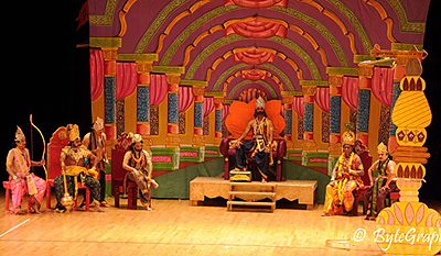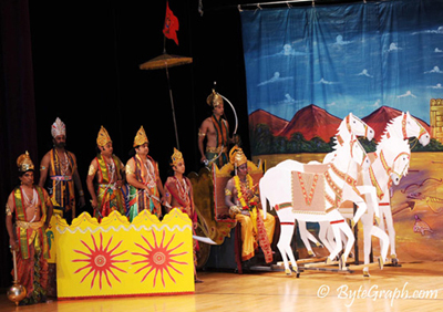 The show Arjuna, embellished with elaborate sets and special effects on stage including matsya yantra, Viraat rupa, arrow bed, chariots provided a visual treat. As per the title, various characters and stories associated with Arjuna in Mahabharatha were presented to the audience, narrated by Vyasa Maharshi.