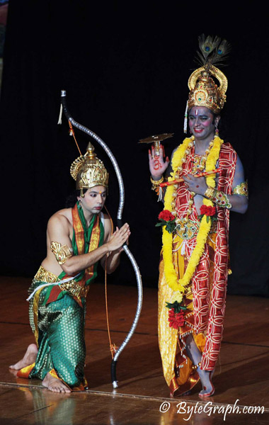 "Arjuna" began with the Kaurava and Pandava princes being sent away to the Gurukul of Dronacharya. Arjuna's focus, determination and eagerness to learn as a student are highlighted through stories where Arjuna, can only see the eye of a bird ( his target ), and nothing else when asked what he sees on top of the tree. Watching Bheema eat in the dark inspires Arjuna to learn 'shabdavedi', the art of shooting target in the dark following the voice. Arjuna's concentration and skills at archery are proven at Raja Drupad's palace where Arjuna wins the 'Swayamvara' contest of Draupadi by shooting a rotating fish by looking at its reflection in the water. Arjuna's dedication wins him the 'Pashupath' from Lord Shiva during the 13 year exile of the Pandavas. The play also depicted the playful side of Arjuna with Subhadra. Arjuna's talent as the dancer 'brahannala', comes to play at King Virat's place where Pandavas are in 'agyatvas' or exile in disguise. Keechaka's lust for Draupadi becomes his cause of death by Bhima. The battlefield of Kurukshetra, with Bhishma on the bed of arrows, Viraata Roopa of Krishna, horse chariots carrying warriors formed the final scene where Arjuna enlightened by the teaching of Lord Krishna known as the Bhagavad Gita, turns into his disciple and devotee concentrating only on his duties and surrendering the results of his actions to the Supreme.