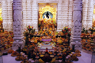 The weeklong festivities reached a climax on Sunday, October 18 with the offering of Annakut, an elaborate offering of thousands of vegetarian food items, all arranged artistically before the sacred images. By preparing food items for the Annakut, followers showed their devotion to God, thanking him for his providence in the past year and seeking his blessings for the year ahead.