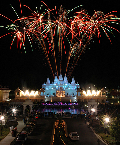 Decorative lights illuminated the Mandir complex during the week when hundreds of followers, dressed in traditional Indian attire, attended ceremonies commemorating the most prominent Hindu holiday of the year. The atmosphere was festive as young children received blessings from their elders and families greeted each other.