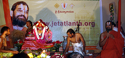 He later went to perform the Kalyanam (marriage) of Lord Srinivasa to Goddess Padmavati and Bhoodevi. The Kalyanotsavam was organized well with each sponsoring family given individual thali (plates) with lamps to perform the rituals. Plenty of volunteers helped around with the distribution of various pooja essentials such as flowers, oil, kumkum and Haldi. The events in Atlanta were organized by priest Seshavataram Puranam, Dr. Jagan Mohan Rao, and Dr. Krishna Mohan.