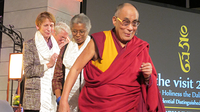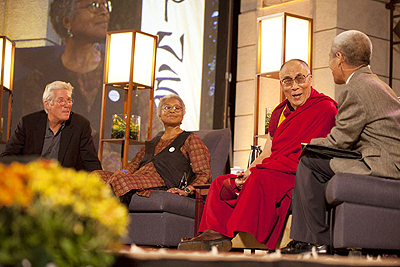 In the afternoon, His Holiness participated in a conversation with artists about the role of the arts in promoting a compassionate society. The conversation titled "The Creative Journey: Artists in Conversation with the Dalai Lama on Spirituality and Creativity" with Richard Gere and Pulitzer Prize-winning author Alice Walker. They started with the question whether the arts have any special responsibility to promote compassion. They also discussed what the artist and the spiritual master have to teach each other from their respective disciplines. His Holiness and the panelists agreed that the arts had much role in promoting compassion. He urged the people in general to use their creativity to uphold democracy, liberty and individual freedom. Regarding the role of the United States in promoting a better world, His Holiness said that since his childhood he had an admiration for the United States as the champion of democracy, liberty and freedom. Since the United States is the leading nation, His Holiness said no matter what happens the American people should not let down their spirits. He added that if the Americans become demoralized it would have negative impact throughout the world.
