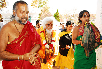 At 11.30 a.m. the venerable Sri Sri Sri Viswayogi Viswamjee Maharaj, with a radiant smile was given a rousing reception, with a Purnakumbham, by the temple officers, priests and leading dignitaries.Swamiji was escorted inside the temples where he offered his prayers and also blessed his devotees. He was courteously seated on an ornate seat and greeted with an impressive Guru Puja.