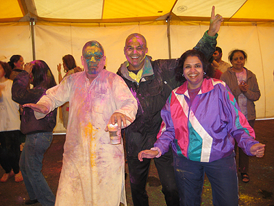 Although the cloudy, cold weather put a damper on the turnout, over 100 people reveled in colors, food, dance and fun. A large outdoor tent on the IACA grounds was the venue for the holi celebrations.