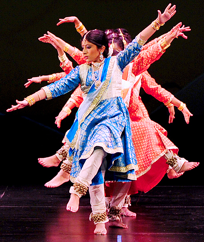 Several other combinations of Kathak, folk, and dance on Hindi film music followed. On a song, “Dhol Bajne Laga…” young performers took over one hundred Jaipur gharana style, chakkars (spins or pirouettes) in less than five minutes. In their performances, kathak dancers matched beat with beat, and audience joined them with their synchronized clapping with dance.