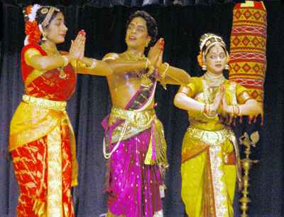 The Master of Ceremonies of the show Smt. Sasikala Penumarthi, who herself is an excellent dancer and runs the Academy of Kuchipudi Dance in Atlanta, introduced the artists at the beginning and presented a bouquet of flowers to each artist as well as a sari to the main singer / teacher Smt. Balla Akka at the end. Two priests showered blessings on the Artists at the end of the program.