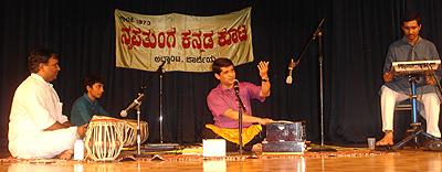 The performance of Ganesh Desai was a musical delight to the crowd. Local artists Anjaneya Shastri (Tabla), Trishul Mallikarjuna (Rhytam pad), Shreyas Srinath (Tabla) accompanied the music with ease and élan. The show stealer was renderence of the song “Vittala” which was an amalgamation of various different “swaras” or notes had the audience spellbound and craving for more. A true entertainer with a sense of humor, Ganesh also crooned to some of the song requests from the crowd. Ganesh is a classical and light vocalist, music director, tabla and harmonium player. He has directed music for dance ballets, documentary films, TV serials, dance dramas, albums, skits and mimes. Ganesh Desai has won the Hero Honda “Suurtaranga” Award for Best Young Artists 2003, “Aryabhata” Kalakusuma Cultural Award for Sugama Sangeeta, Bangalore-2000 for his performances.