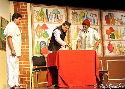 Rawal’s thought provoking play with irrepressible wit and humor is about an atheist’s battle with God. Krishan (Rawal) is an atheist who runs an antique shop together with a loyal employee Vasant (Nilesh Pandya). Atheist Krishan mocks and ridicules his wife Sushila (Manish Vora) who is very devout One day an earthquake destroys his shop. The Insurance Agent, (Ankit Trivedi) visits Krishan at his home and informs him that the claim will be rejected because the loss occurred due to an “Act of God”. Krishan challenges the agent to prove that the earthquake was in fact the Act of God and if so, he would sue God for recovery of damages. He files a case against God.