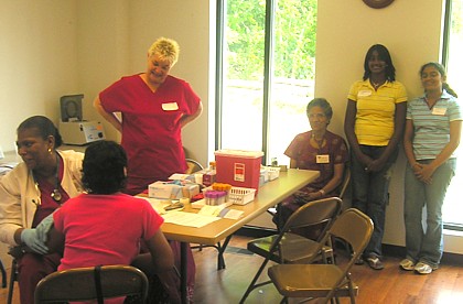 by Madhusudhana Reddy and his wife Dr.Haritha under the Supervision of Dr. Sujatha Reddy .Dr. Ashok Kancharla from the Tri-County Medical Center,Royston,provided the equipment to carry out the Bone-density tests.And over 120, cost –effective, basic quality comprehensive Chemistry profile of blood tests with PSA, HBA1c, and Sickle cell prep. were carried out at a nominal fee of $15 per test. The lab work was provided by Medical Center of Middle Georgia Lab., Macon. It is noteworthy that the results of the blood work were mailed within 48 hours! The test results helped identify several life threatening situations which were immediately notified to the persons concerned.