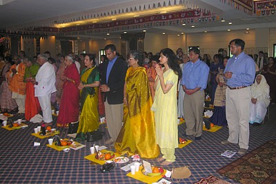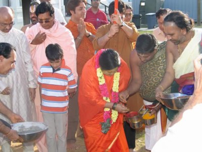 On the beautiful sunny morning of Thursday, Amma clad in an orange sari, with her radiant smile was given a rousing welcome by the eager devotees, Trustees and the priests of the Hindu Temple, with a ceremonious Poorna kumbham ceremony, accompanied with auspicious music and mantra chanting, garlanding, and presenting her with flower bouquets and graciously escorting her inside the Shiva Temple, where she offered her prayers to the deities.