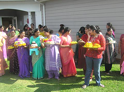 The Goddess Gowri seemed to be pleased with the efforts and blessed the event. It was a very nice sunny day, perfect for an out door celebration. People purchased various colorful flowers for Bathukamma preparation. This activity brought back nostalgic memories from “back home” where children used to collect various wild flowers like Gunugu poolu, Thangedu Poolu and other domestic flowers like Beera Poolu and Cutley Poolu from the fields, not necessarily their own. The ladies creatively substituted locally available flowers like different color roses, chamanti, banti etc in decorating the Bathukamma’s, as Gunugu poolu, Thangedu Poolu are not available in North America.