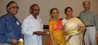 Dr. Aruna Prasad Kancherla, president of the temple briefed the gathering about the event being celebrated through out the US and expressed his happiness to become a part of its culture and practice. Dr. Mangaraju Vanapalli, chairman of Puja committee thanked all for their attendance at the event and appreciated the teamwork of all volunteers. Dr. Tulasi Vanapalli coordinated the arrangements with temple kitchen. Temple authorities felicitated Rangachari, permanent Cook in the temple kitchen and Mrs. Mallikarjuna Sarma, a devotee of the temple for their untiring work in the temple kitchen and in the service of the devotees. Temple provides food each day at nominal cost on an average 100. On weekends and on feast days the number may be more than three times that much and it exceeds double triple on weekends and on festive days. One permanent cook, Rangachari and two helpers besides a number of volunteers under the supervision of Ms. Uma Reddy, chairwoman of kitchen committee of the temple, are managing the temple kitchen.