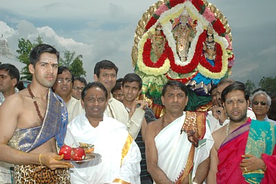 After placing the lingams at appropriate places, the deities of Lord Siva, Ramaligeswara together with his consorts were taken out in a colorful prakarotsavam (procession) around the temple. The 108 sponsors worshipped the Siva lingams under the guidance of priests in accordance with Hindu rituals. After completion of puja, a celestial bath (abhishekam) was given to a huge Siva Lingam, specially erected for the purpose with honey, milk, juices, sugar, vibhuti, ghee, water, coconut water and so on. Then followed Siva sahasranama puja. Rituals connected with Laksha Lingarchana were completed in six hours and the sponsors sat through the process and did all the pujas with patience and devotion as guided by the priests. Swami Chidatmananda of Chinmaya Mission visited the temple on the occasion and temple authorities received him with temple honors. Devotees felt happy to see him so unexpectedly at the temple Swami Chidatmananda is popular for his discourses on TV channels.