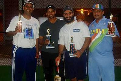 All the four teams reaching the finals had a distinction – Pawan and Ravi played an unbelievable 96 overs by the end of the day and they showed their sporting spirit till the last ball of the day. Vijay and Arpit made the highest score of the tournament with 97 runs from six overs in their second round match without loosing a wicket. Sravan Vellanki took the only hat-trick of the tournament with his mix of medium pace and off-cutters. Anubhav Jain, winner of the 2001 Vibha Cricket tournament proved that he is getting better with age, with his huge pulls over mid-wicket for a number of sixes, taking his team’s net score to 64. But the final round was completely dominated by the ultimate winners Amit and Navneeth, who did a terrific job both with the bat and the ball, scoring a net score of 84 runs in six overs.