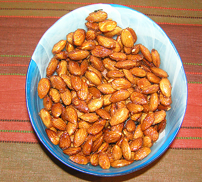 Mix honey, ghee and water in a 3-quart saucepan and boil it in medium heat for two minutes. Add almonds to the honey mixture while mixing until all the liquid is evaporated. Remove pan from the heat.
