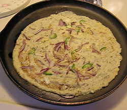 Heat a flat 11-inch non-stick skillet on medium heat. Sprinkle few drops of water to see if the pan is hot enough. If the water sizzles that means the pan is ready. Pour half a teaspoon of oil on the pan and wipe it clean to condition the pan so that the batter don’t stick to the pan. Take a ladle full of batter and pour it on the griddle. Spread it with the bottom of the ladle in a circular motion to make a thin dosa. Sprinkle a tablespoon onion mixture on top of dosa. Press onions with spatula so that they do not fall off when you turn it.
