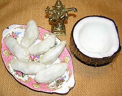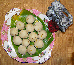 Break off a small lime size ball of rice dough. Take few drops of oil into your hands. Place the rice ball in one hand and pat it into an oval shaped flat disk with the other hand. Fill it with a teaspoon of the filling. Seal the edges shaping it like a jilledu kaya (see the accompanying picture). Seal the jilledu kayalu tightly. Otherwise they will pop open during steaming