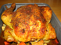 Garnish the chickens with the egg mix, spreading with a spatula. Cut at the thigh joint and in the middle of the chest cavity but don’t take the pieces apart. Serve hot with plain cooked rice or naan and finely cut rings of onions with lemon wedges.