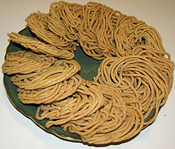 Fill a Janthika press (having 1/8 inch holes) with the dough and press in to the hot oil. Turn once or twice for crispiness. Spread some newspapers away from the stove, and lay some paper towels on top. Place the fried murukulu on top of paper towels in single layer to absorb oil from
