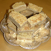 With a sharp knife cut the Mysore pak into one inch wide and two inches long pieces. The pieces should have light brown color in the middle and yellow color on top and bottom. Arrange them nicely in a serving plate.