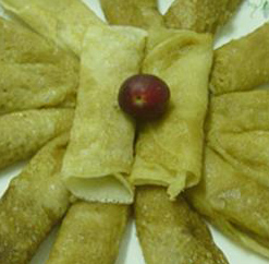 Boil the milk with 2-3 tbsp sugar and thicken iuto pancake consistency. Make a batter with rice powder and soaked suji(for 10-15 min) using sugar and milk. Wipe a non-stick pan with ghee/oil and make small pancakes with the prepared batter, putting the khowa filling inside. Then fold the pancake. A sweet coconut filling can also be used instead of the khowa filling.